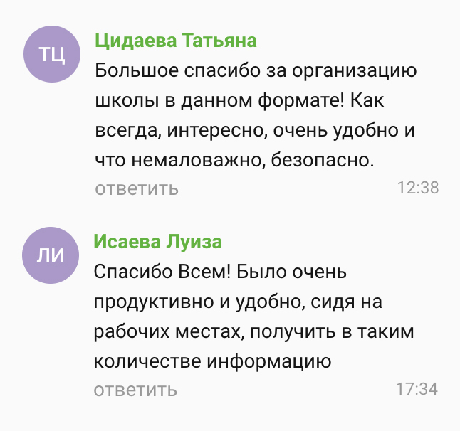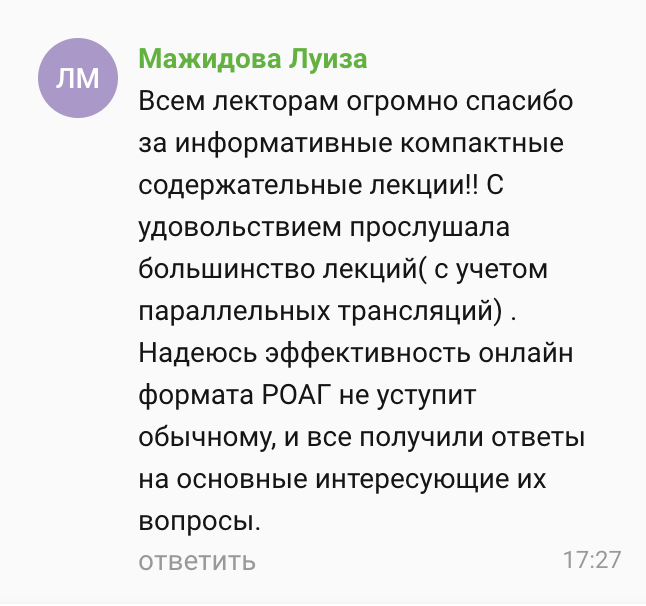 Мне понравилась проведенная трансляция. Много полезной, важной и нужной информации. Несмотря на ситуацию с карантином удалось побывать на мероприятии дистанционно. За что я благодарна. Очень доступный материал, информативно подготовленные вебинары. Желаю продолжения вашей работы на таком же уровне и дальнейшего развития.